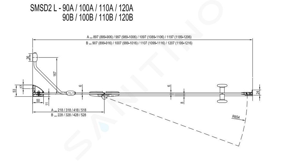 A Smartline SMSD2 zuhanyajtók 2 változatban kaphatók. Az A változatot a szabványos termékméretnél legfeljebb 11 mm-rel kisebb építési nyílásokhoz tervezték. A B opciót a szabványos termékméretnél legfeljebb 16 mm-rel nagyobb építési nyíláshoz tervezték. Tömör fallal való kombinációhoz válassza az SMSD2 B ajtó típust.