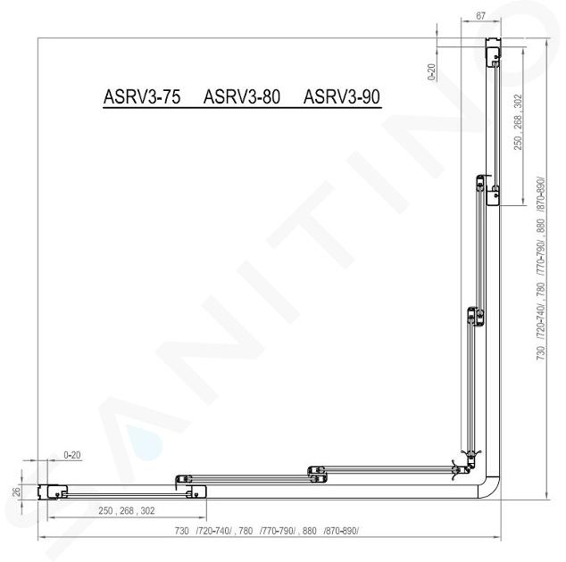 A sarokzuhanykabin kialakításához 2 darab ASRV3 típusú tolóajtót kell rendelnie. Minden csomag tartalmaz egy sarokcsuklót. A két rész különböző méreteinek kombinálásával négyzet vagy téglalap alakú zuhanykabint kaphat. (pl. 750 x 900 mm, 900 x 900 mm, 800 x 1000 mm stb.)