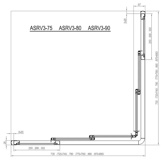 A sarokzuhanykabin kialakításához 2 darab ASRV3 típusú tolóajtót kell rendelnie. Minden csomag tartalmaz egy sarokcsuklót. A két rész különböző méreteinek kombinálásával négyzet vagy téglalap alakú zuhanykabint kaphat. (pl. 750 x 900 mm, 900 x 900 mm, 800 x 1000 mm stb.)