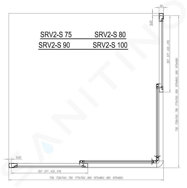 A sarokzuhanykabin kialakításához 2 darab SRV2-S típusú tolóajtót kell rendelnie. A két rész különböző méreteinek kombinálásával négyzet vagy téglalap alakú zuhanykabint kaphat. (pl. 750 x 900 mm, 900 x 900 mm, 800 x 1000 mm stb.)